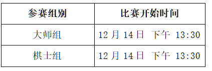 2、报名级别分组,分为大师组和棋士组。获得候补大师以上级别报大师组参赛,获得一级棋士(含)以下级别报棋士组参赛