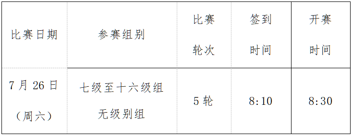 (2)十三级和十四级组(8人)、十五级和十六级组(8人)、无级别组(4人)均采用双方共用30分钟后每方5分钟包干。