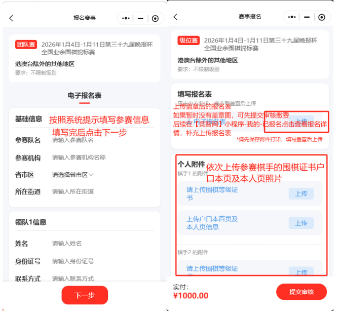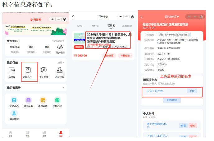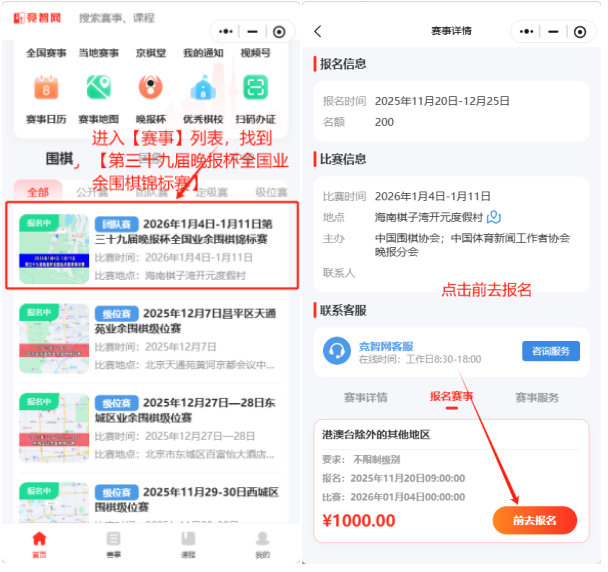 报名方式:微信搜索竞智网小程序,注册账号后进入【赛事】列表,找到【第三十九届晚报杯全国业余围棋锦标赛】,点击链接进入【赛事详情】,点击【前去报名】,按照系统流程报名。流程图如下