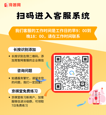 2.报名系统使用问题咨询:请扫描下方二维码、添加竞智网客服(咨询报名系统使用)。