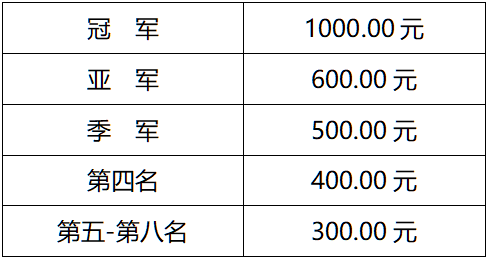 1、各组取前八名颁发奖金、证书,前三名同时颁发奖牌奖金: