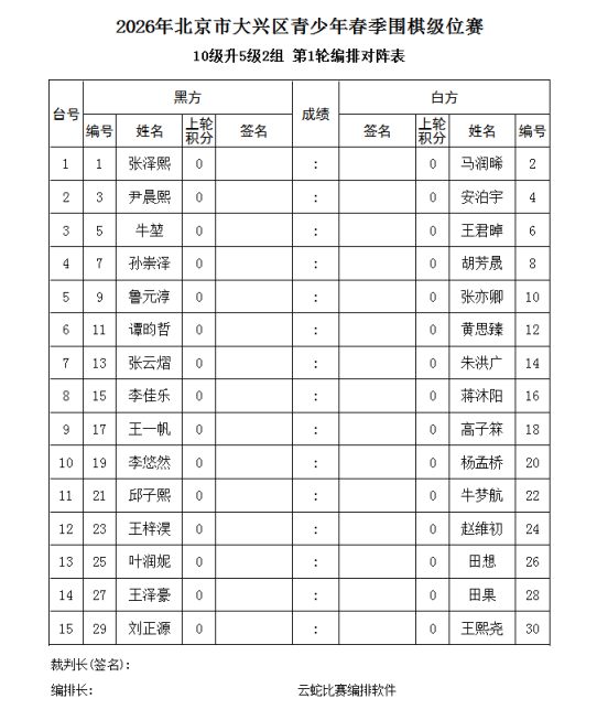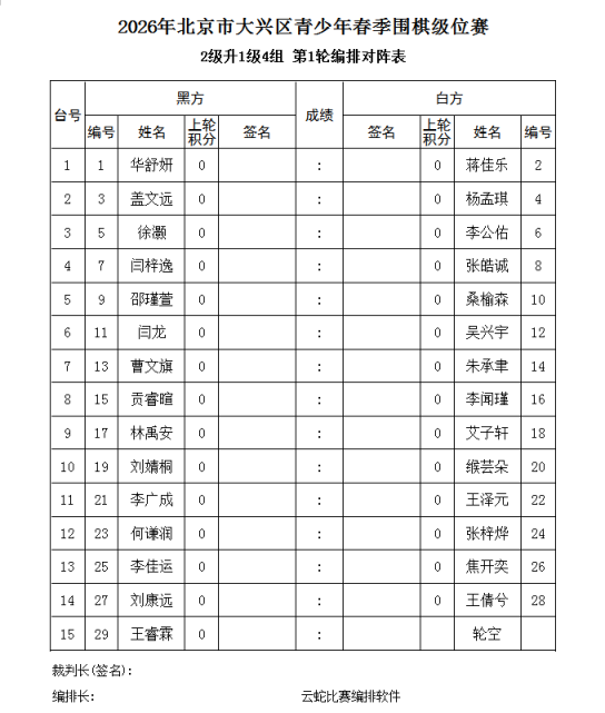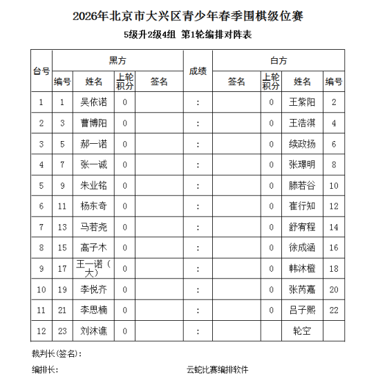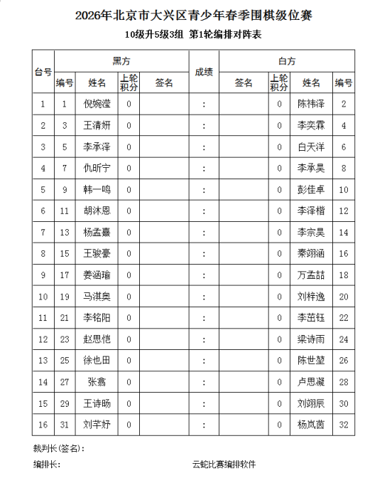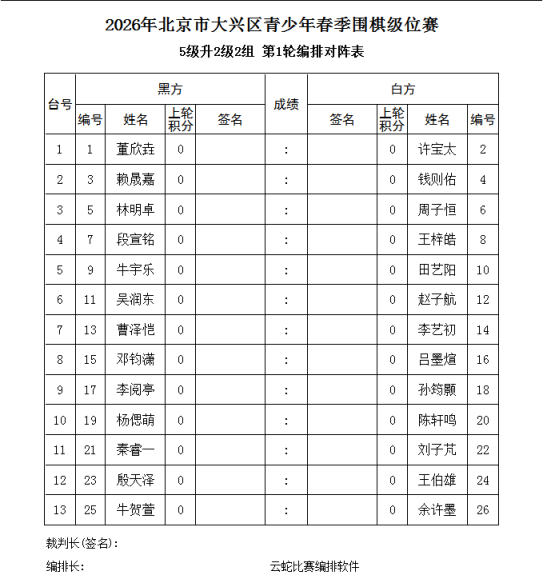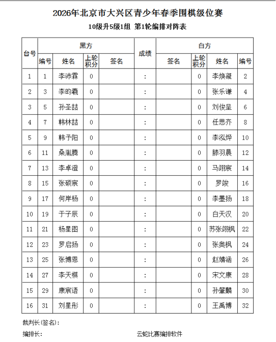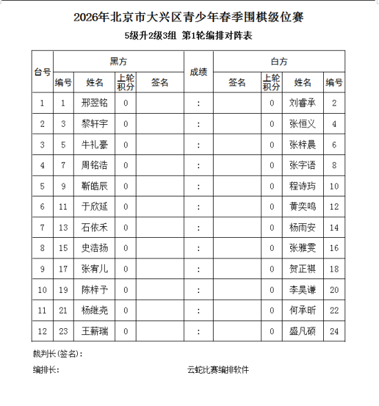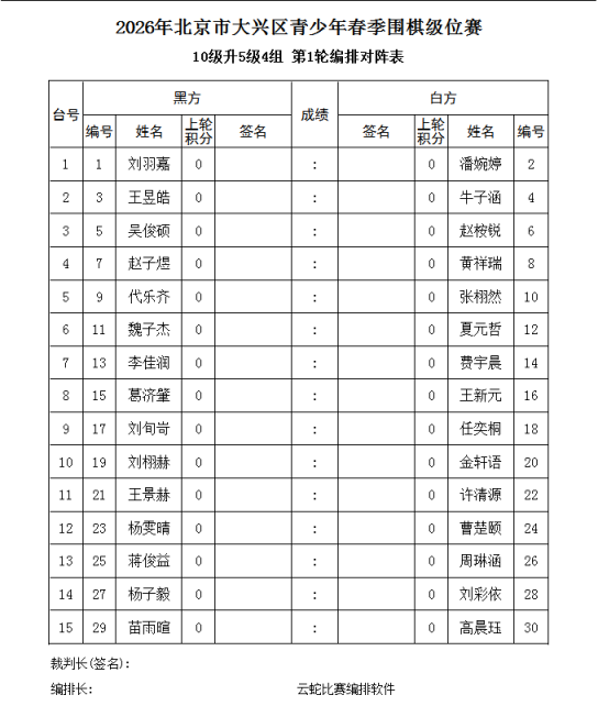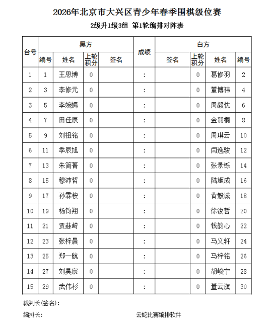 3、电脑积分编排(使用云蛇编排软件)。每轮比赛的先后手,均由电脑编排确定。